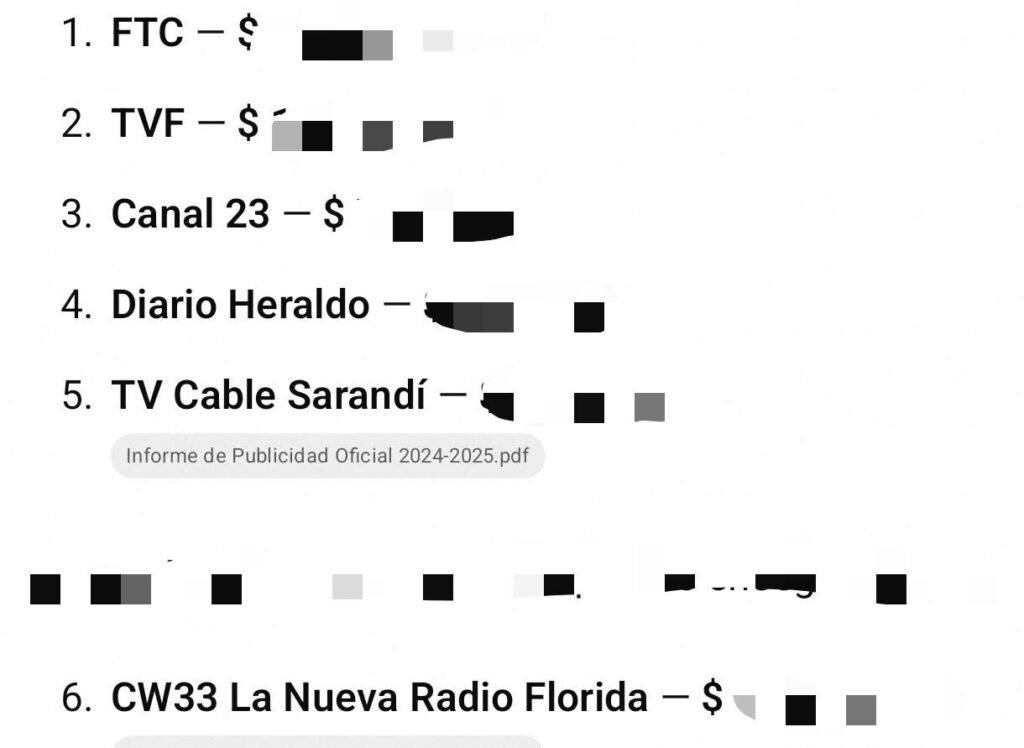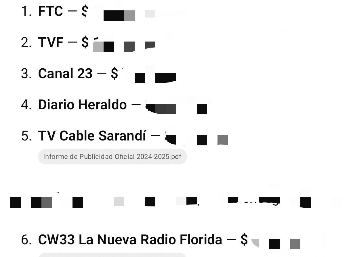 Según la documentación entregada por la Intendencia de Florida en el expediente N.º 2025-86-001-02548, estos serían los medios que más dinero público recibieron en publicidad oficial durante el período informado. La información fue obtenida tras un extenso trámite administrativo impulsado por quien suscribe y luego de actuaciones ante la UAIP, que concluyeron con la desclasificación del desglose que inicialmente había sido negado.