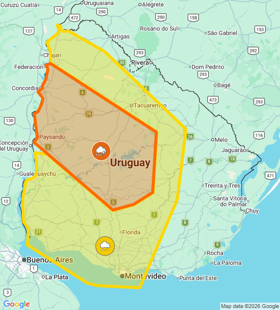 Advertencia amarilla por Persistencia de tormentas puntualmente fuertes y lluvias abundantes Se actualizará a las 11:00 o ante cambios significativos Más info: http://inumet.gub.uy