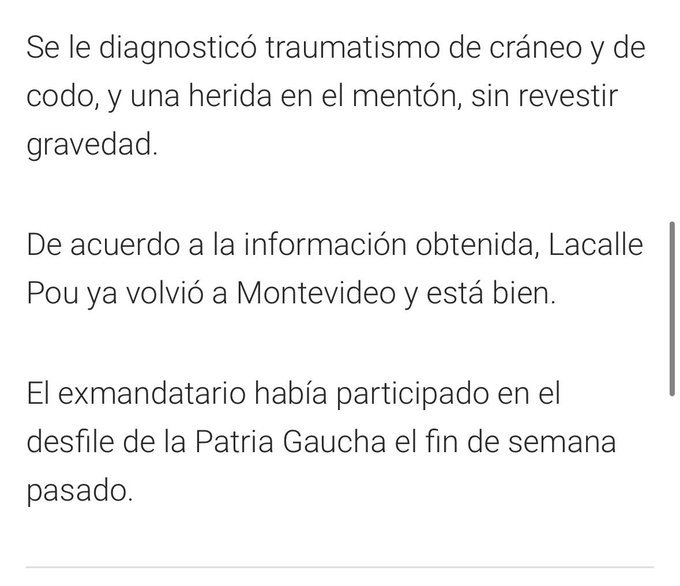 “Lacalle Pou” Porque sufrió un accidente andando a caballo en Tacuarembo y debió ser llevado al hospital donde se le diagnosticó traumatismo de cráneo y herida en el mentón pero sin gravedad y ya se encuentra de nuevo en Montevideo