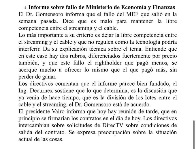 Preve, en su cuenta de la red social X realizó un posteo que decía: “ ¿Y esto? Acta de la última Directiva de Nacional en la que dirigentes plantean su preocupación por una posible cláusula de salida de DIRECTV del contrato con la AUF por los derechos de TV del fútbol uruguayo, tras recibir a Javier Gomensoro, asesor de Ignacio Alonso”.